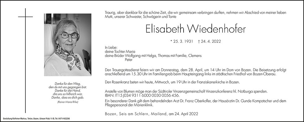 Anstatt Blumen möge man der Südtiroler Vinzenzgemeinschaft Vinzenzkonferenz Hl. Notburga spenden.