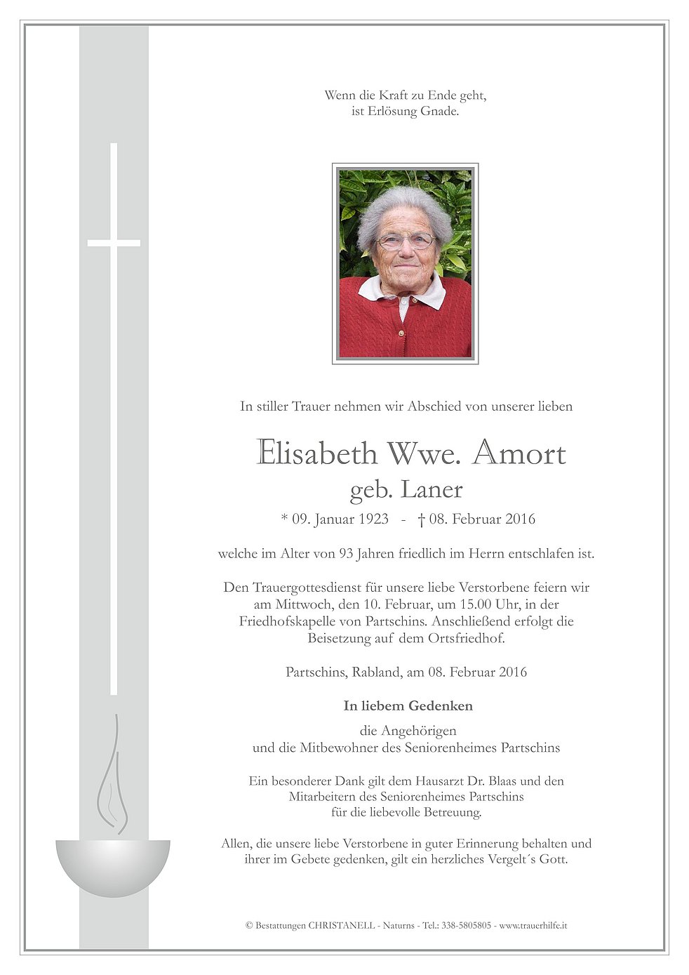 Den Trauergottesdienst für unsere liebe Verstorbene feiern wir am Mittwoch, den 10. Februar, um 15.00 Uhr, in der Friedhofskapelle von Partschins. Anschließend erfolgt die Beisetzung auf dem Ortsfriedhof.