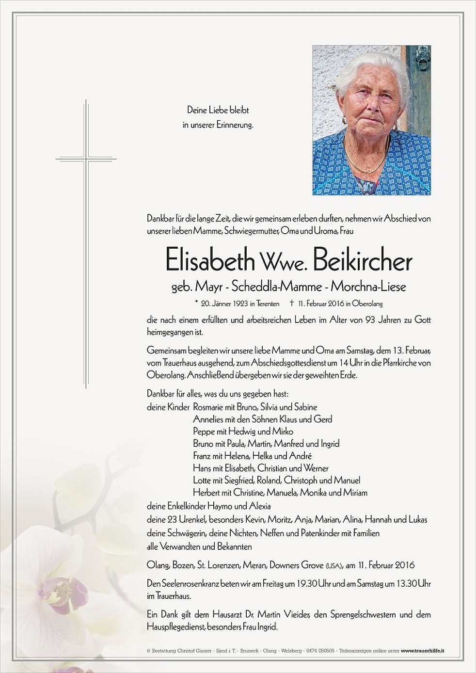 Gemeinsam begleiten wir unsere liebe Mamme und Oma am Samstag, dem 13. Februar, vom Trauerhaus ausgehend, zum Abschiedsgottesdienst um 14 Uhr in die Pfarrkirche von Oberolang. Anschließend übergeben wir sie der geweihten Erde.