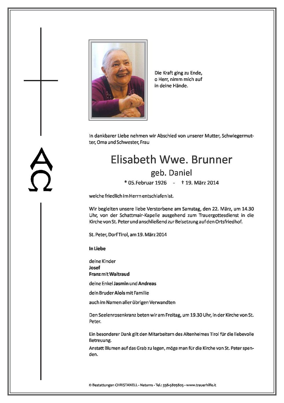 Wir begleiten unsere liebe Verstorbene am Samstag, den 22. März, um 14.30 Uhr, von der Schattmair-Kapelle ausgehend zum Trauergottesdienst in die Kirche von St. Peter und anschließend zur Beisetzung auf den Ortsfriedhof.
