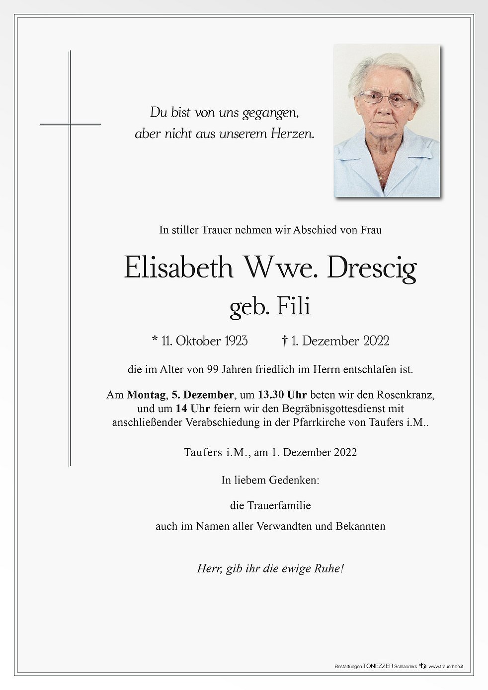 Am Montag, 5. Dezember, um 13.30 Uhr beten wir den Rosenkranz, und um 14 Uhr feiern wir den Begräbnisgottesdienst mit anschließender Verabschiedung in der Pfarrkirche von Taufers i.M..