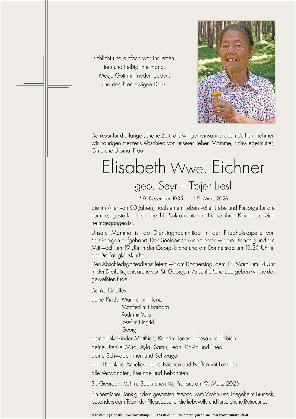 Unsere Mamme ist ab Dienstagnachmittag in der Friedhofskapelle von St. Georgen aufgebahrt. Den Seelenrosenkranz beten wir am Dienstag und am Mittwoch um 19 Uhr in der Georgskirche und am Donnerstag um 13.30 Uhr in der Dreifaltigkeitskirche.