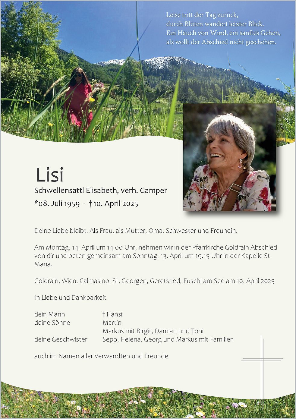 Am Montag, 14. April um 14.00 Uhr, nehmen wir in der Pfarrkirche Goldrain Abschied von dir und beten gemeinsam am Sonntag, 13. April um 19.15 Uhr in der Kapelle St. Maria.