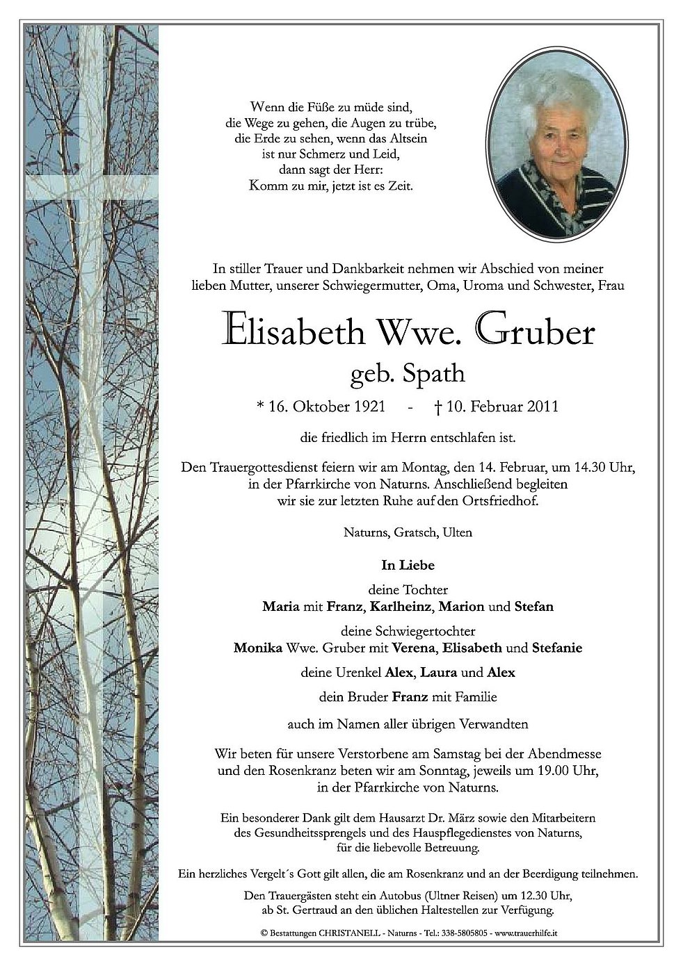 Den Trauergottesdienst feiern wir am Montag, den 14. Februar, um 14.30 Uhr, in der Pfarrkirche von Naturns. Anschließend begleiten wir sie zur letzten Ruhe auf den Ortsfriedhof.