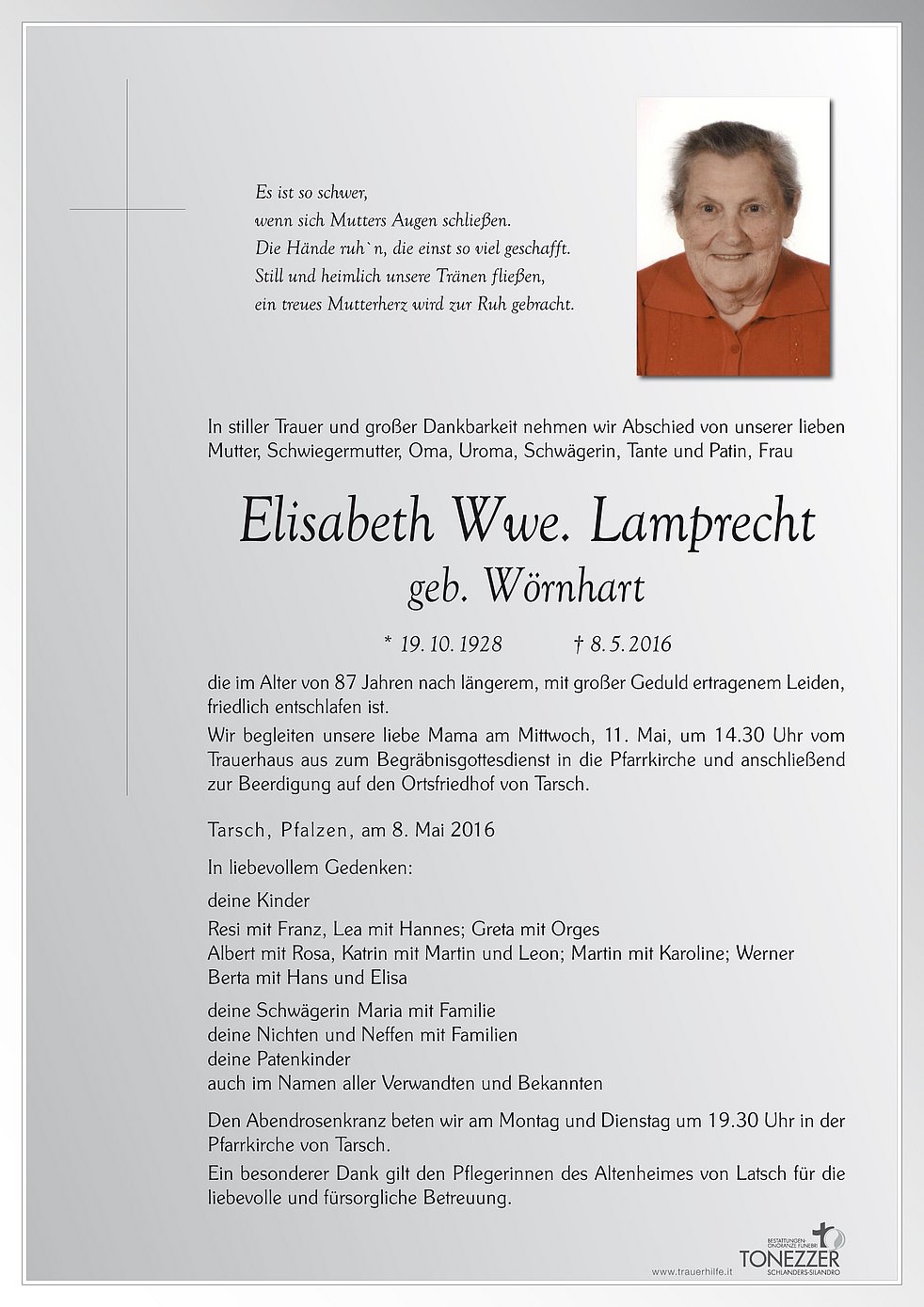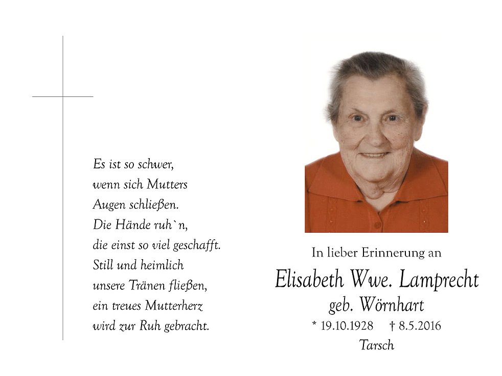 Wir begleiten unsere liebe Mama am Mittwoch, 11. Mai, um 14.30 Uhr vom Trauerhaus aus zum Begräbnisgottesdienst in die Pfarrkirche und anschließend zur Beerdigung auf den Ortsfriedhof von Tarsch.