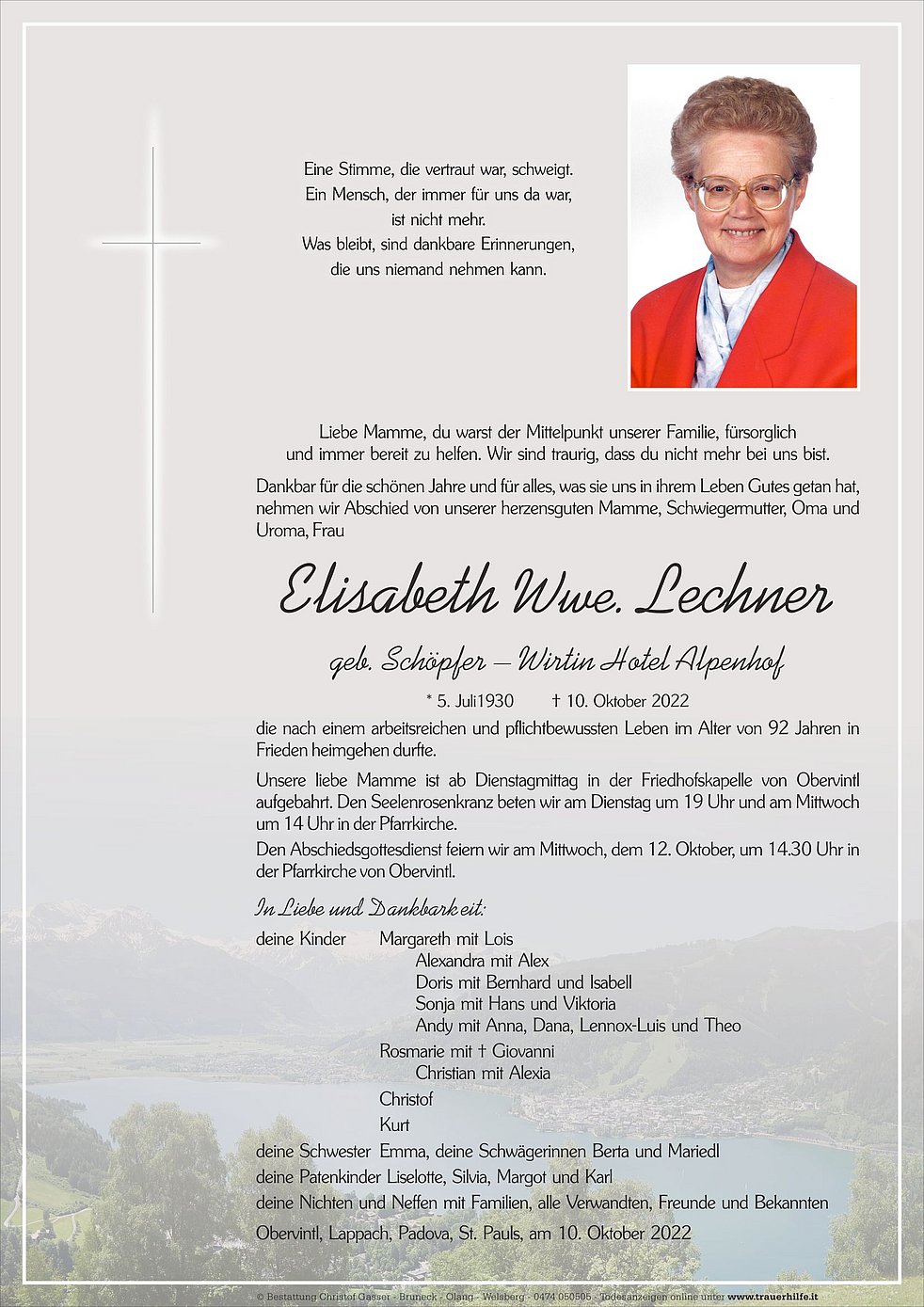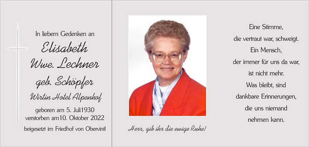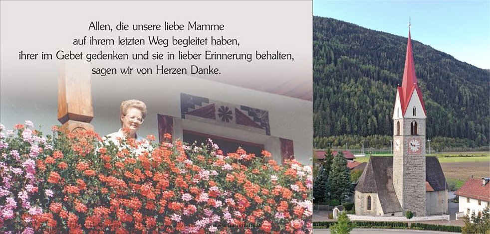 Unsere liebe Mamme ist ab Dienstagmittag in der Friedhofskapelle von Obervintl aufgebahrt. Den Seelenrosenkranz beten wir am Dienstag um 19 Uhr und am Mittwoch um 14 Uhr in der Pfarrkirche.