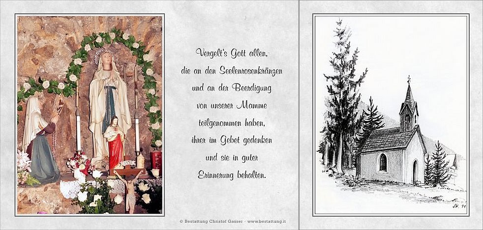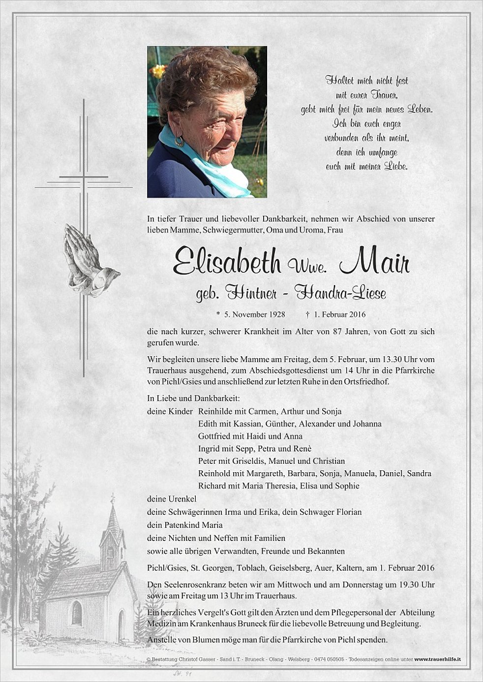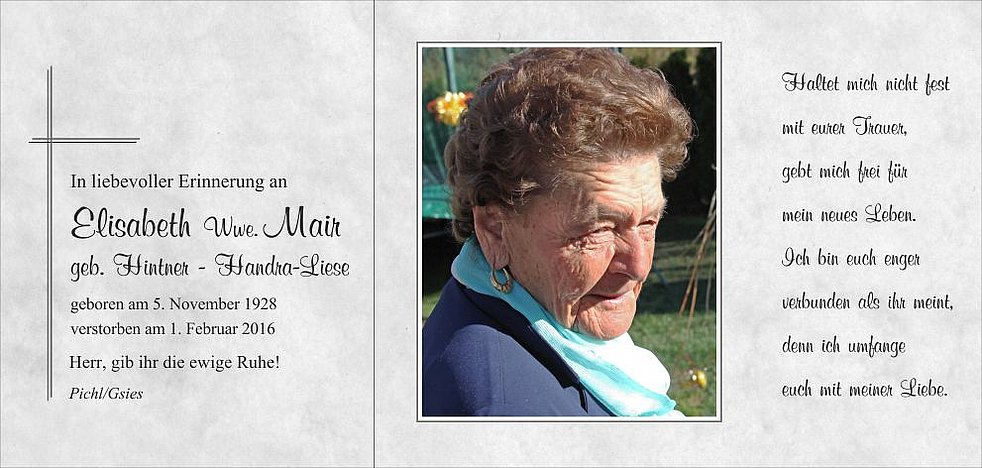 Wir begleiten unsere liebe Mamme am Freitag, dem 5. Februar, um 13.30 Uhr vom Trauerhaus ausgehend, zum Abschiedsgottesdienst um 14 Uhr in die Pfarrkirche von Pichl/Gsies und anschließend zur letzten Ruhe in den Ortsfriedhof.