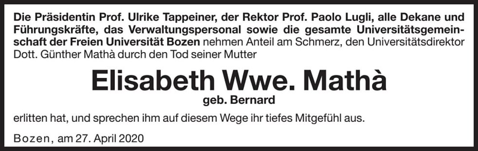 Wir danken den Pfleger/innen des Jesuheimes sowie allen Ärzten/innen und Pfleger/innen der neuen Covid19 - Abteilung des Krankenhauses Bozen für ihre unermüdliche Fürsorge und Wertschätzung.