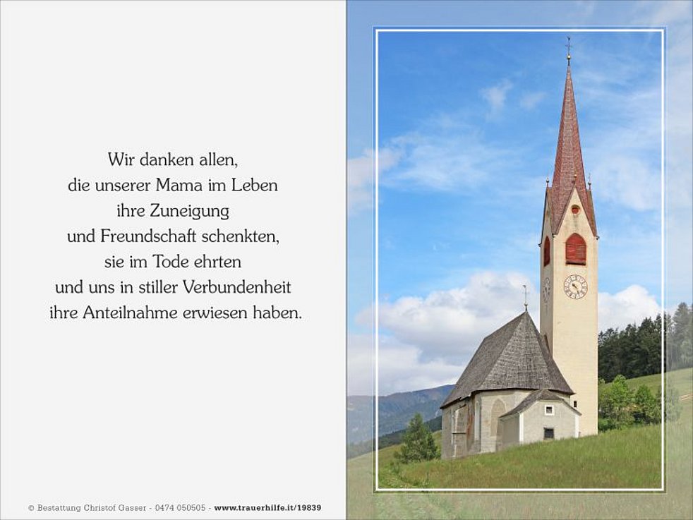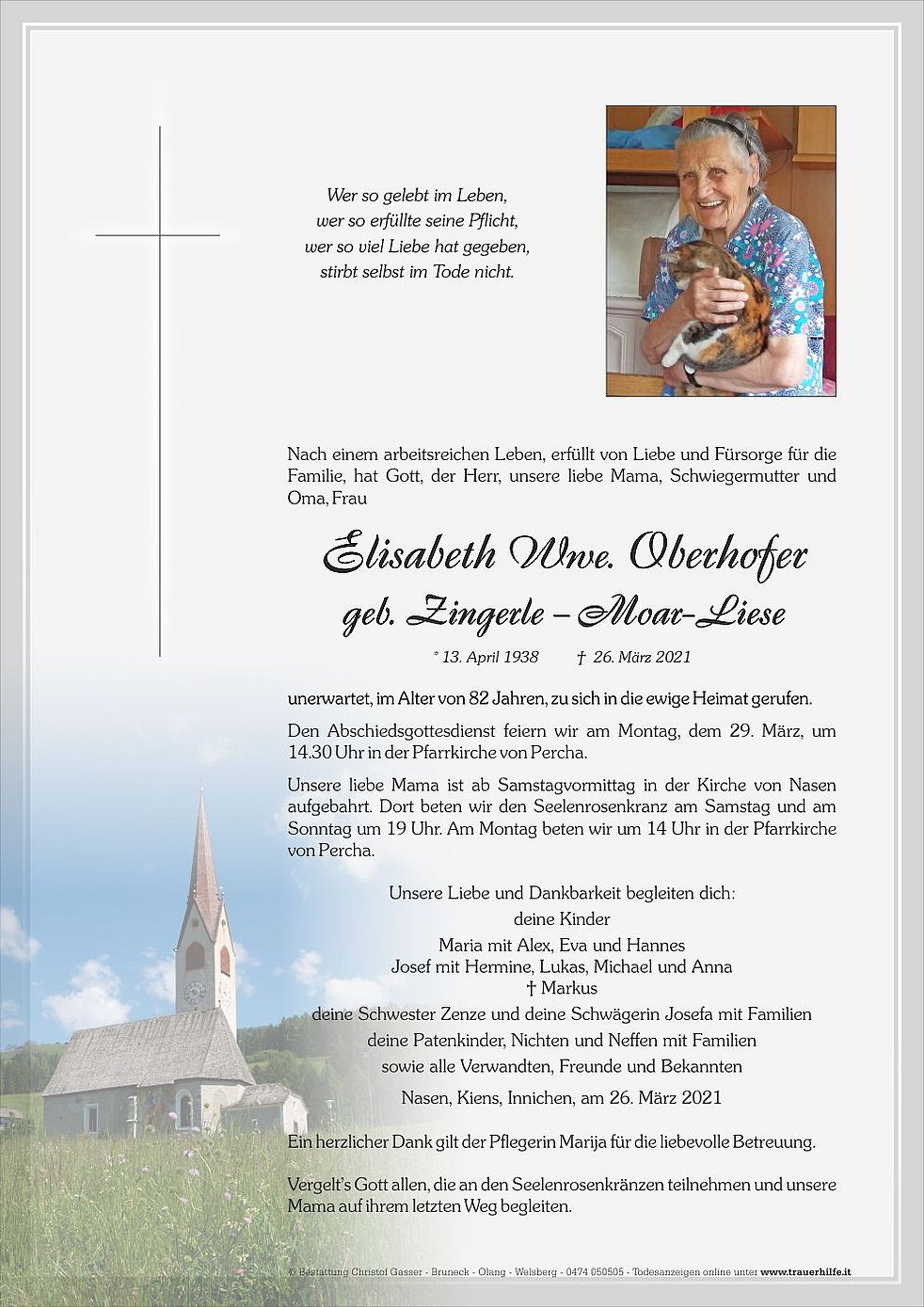 Unsere liebe Mama ist ab Samstagvormittag in der Kirche von Nasen aufgebahrt. Dort beten wir den Seelenrosenkranz am Samstag und am Sonntag um 19 Uhr. Am Montag beten wir um 14 Uhr in der Pfarrkirche von Percha.