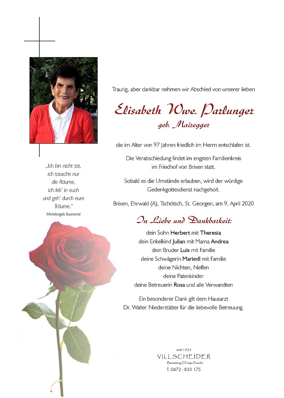 Lieber Herbert, mein aufrichtiges Beileid. Ich bin so traurig über die Nachricht, dass meine Lieblings-Tante Elsa von uns gegangen ist. Ich bin mir sicher, dass sie in Gottes Armen aufgenommen worden ist und dort in Frieden ruhen wird. Ich werde sie immer in meinem Herzen tragen.