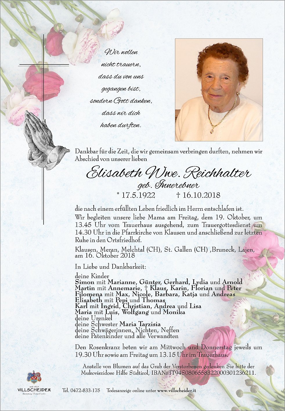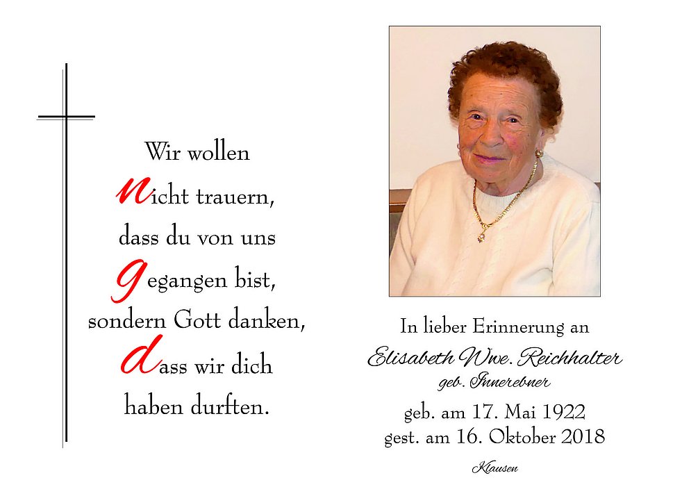 Wir begleiten unsere liebe Mama am Freitag, dem 19. Oktober, um 13.45 Uhr vom Trauerhaus ausgehend, zum Trauergottesdienst um 14.30 Uhr in die Pfarrkirche von Klausen und anschließend zur letzten Ruhe in den Ortsfriedhof.