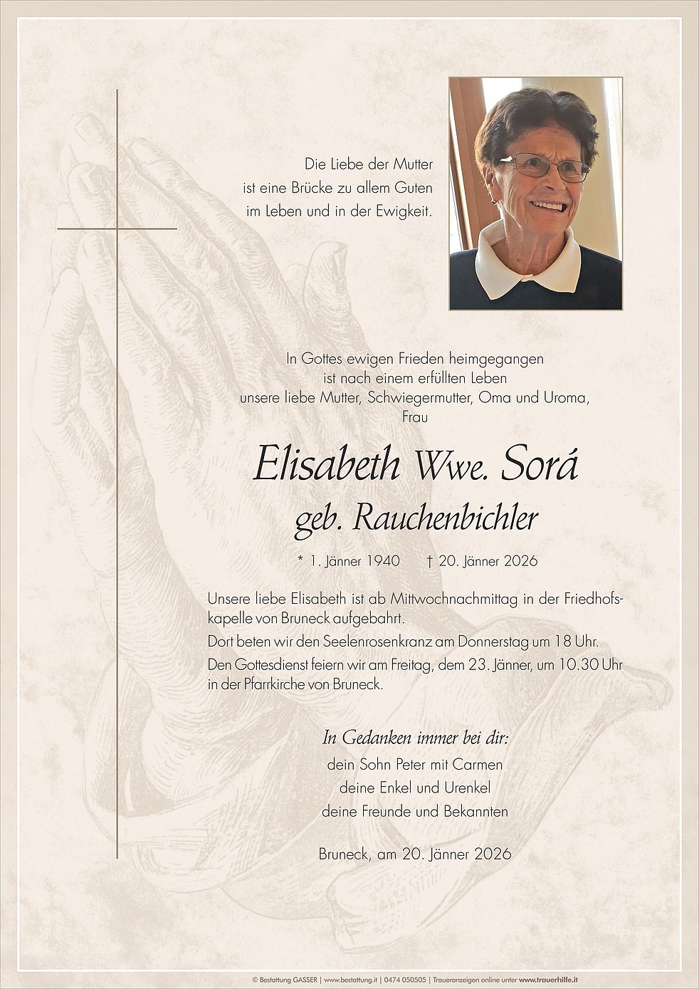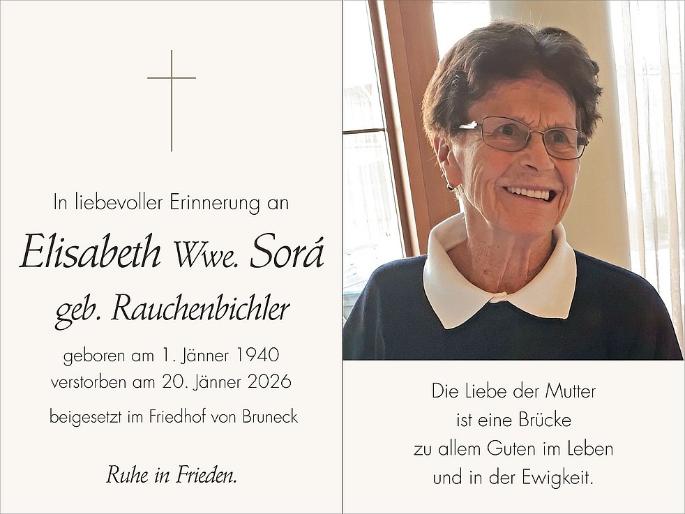 Unsere liebe Elisabeth ist ab Mittwochnachmittag in der Friedhofs-kapelle von Bruneck aufgebahrt.