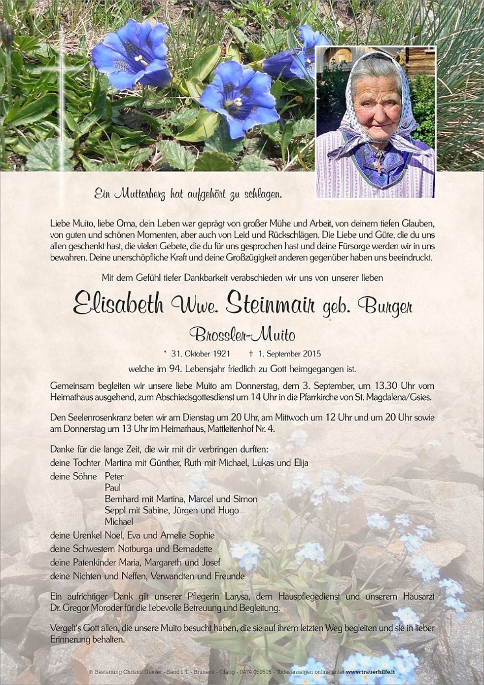 Ein aufrichtiger Dank gilt unserer Pflegerin Larysa, dem Hauspflegedienst und unserem Hausarzt Dr. Gregor Moroder für die liebevolle Betreuung und Begleitung.