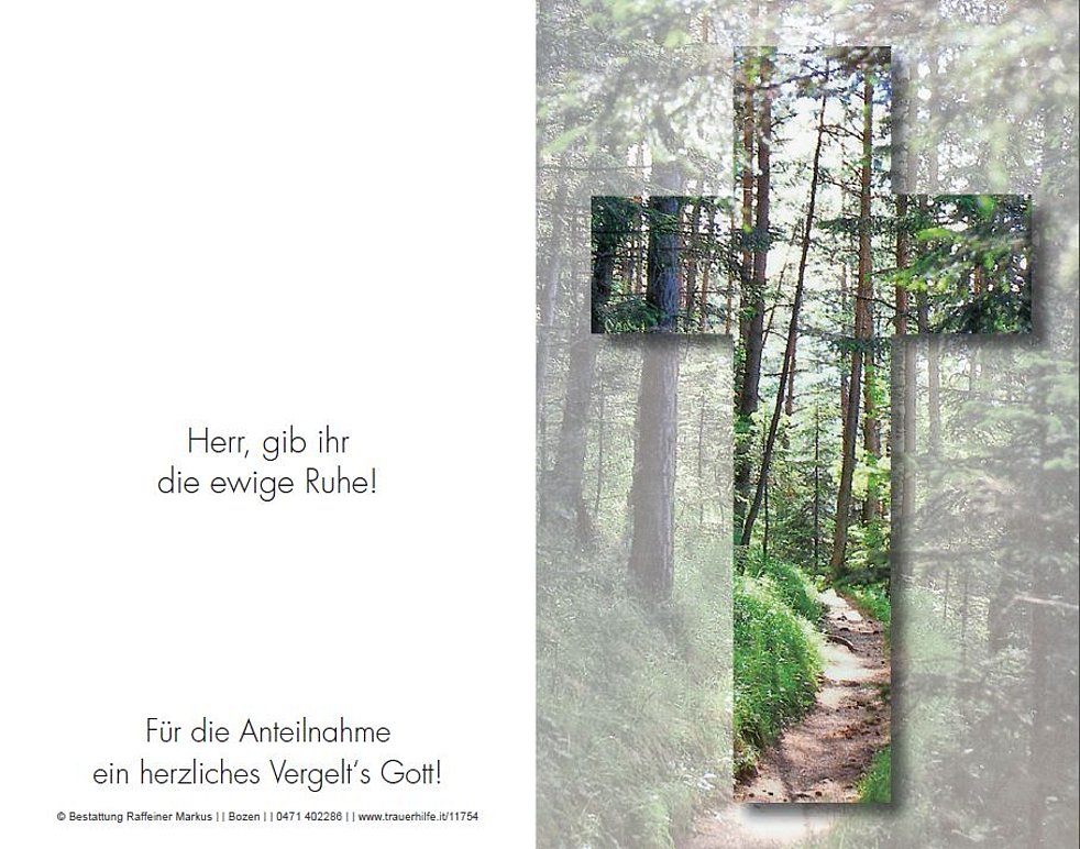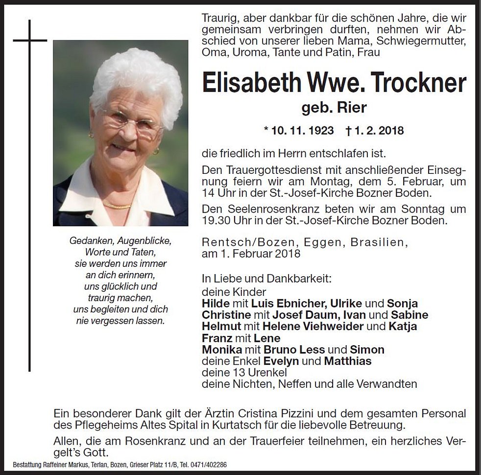 Den Trauergottesdienst mit anschließender Einsegnung feiern wir am Montag, dem 5. Februar, um 14 Uhr in der St. Josef Kirche Bozner-Boden.