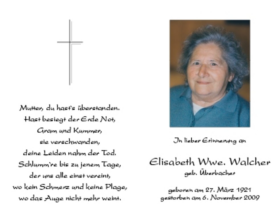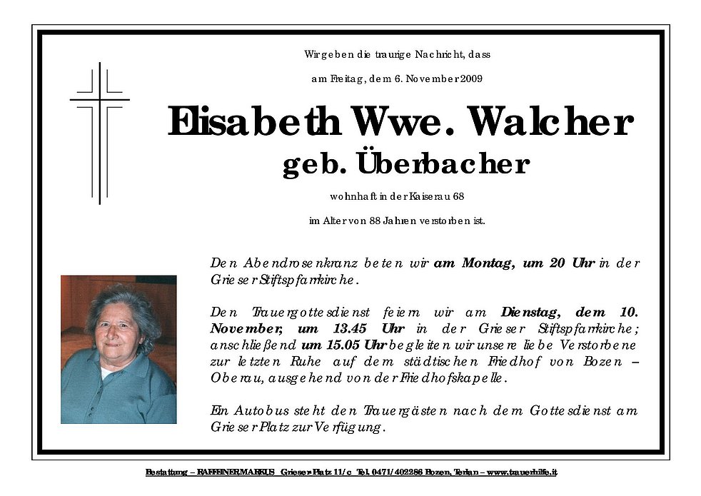 Den Trauergottesdienst feiern wir am Dienstag, dem 10. November, um 13.45 Uhr in der Grieser Stiftspfarrkirche; anschlieβend um 15.05 Uhr begleiten wir unsere liebe Mama zur letzten Ruhe auf den städtischen Friedhof von Bozen-Oberau, ausgehend von der Friedhofskapelle.