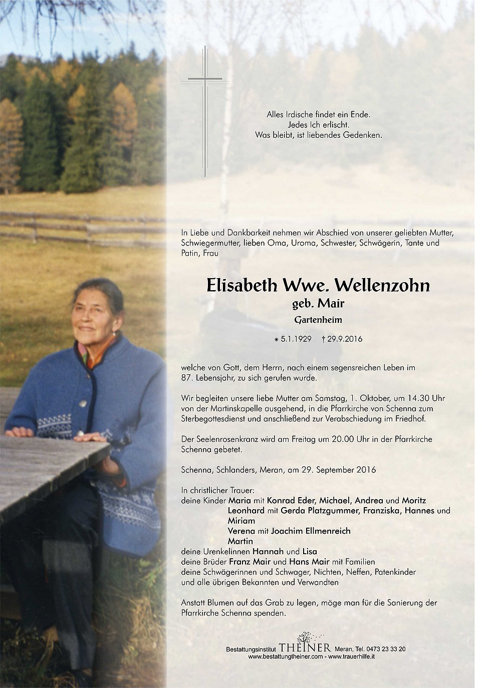 Wir begleiten unsere liebe Mutter am Samstag, 1. Oktober, um 14.30 Uhr von der Martinskapelle ausgehend, in die Pfarrkirche von Schenna zum Sterbegottesdienst und anschließend zur Verabschiedung im Friedhof.
