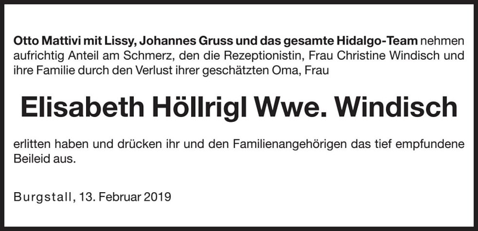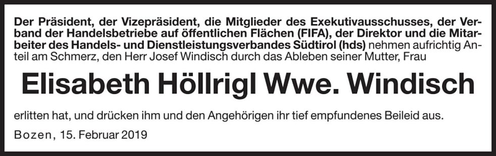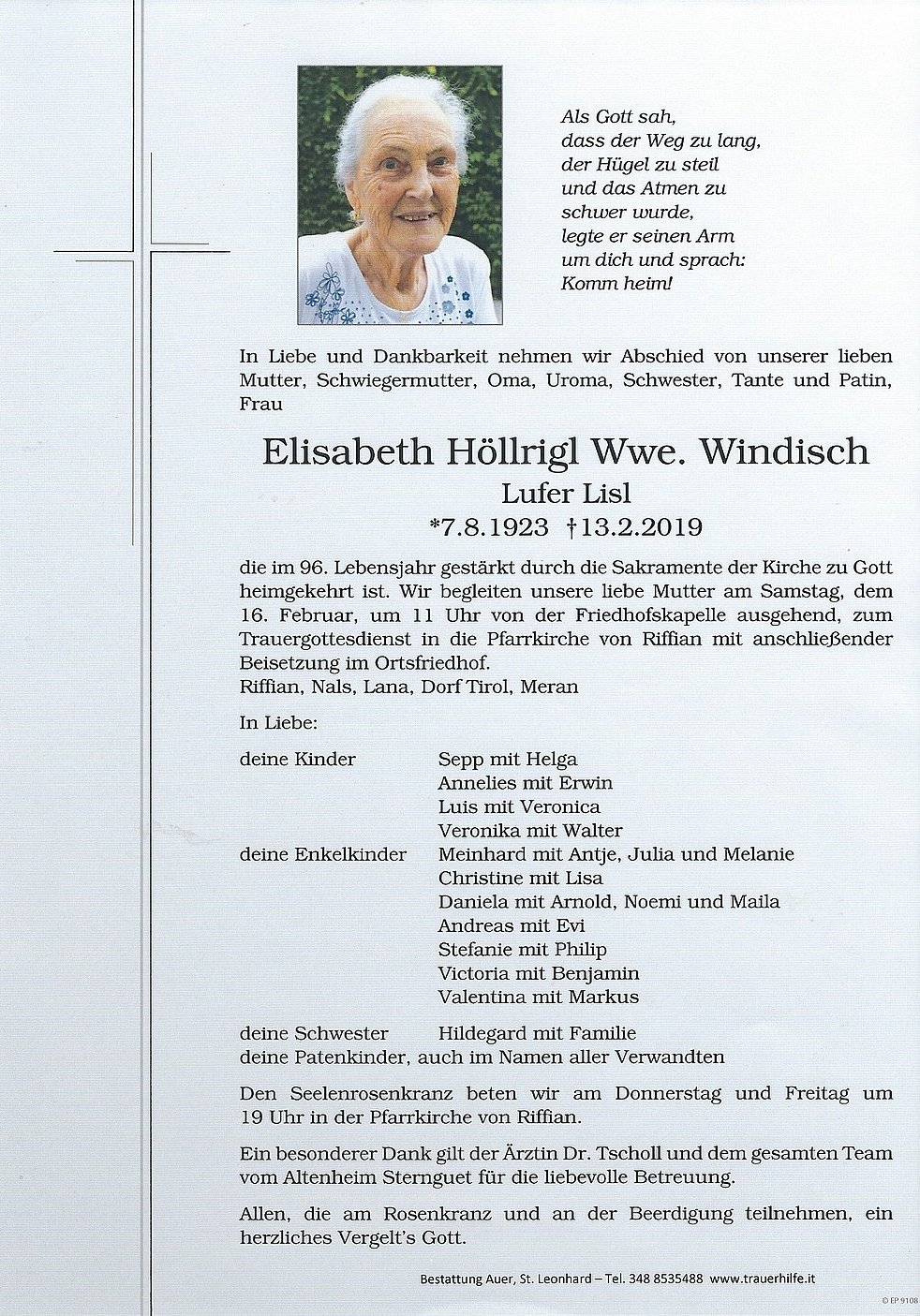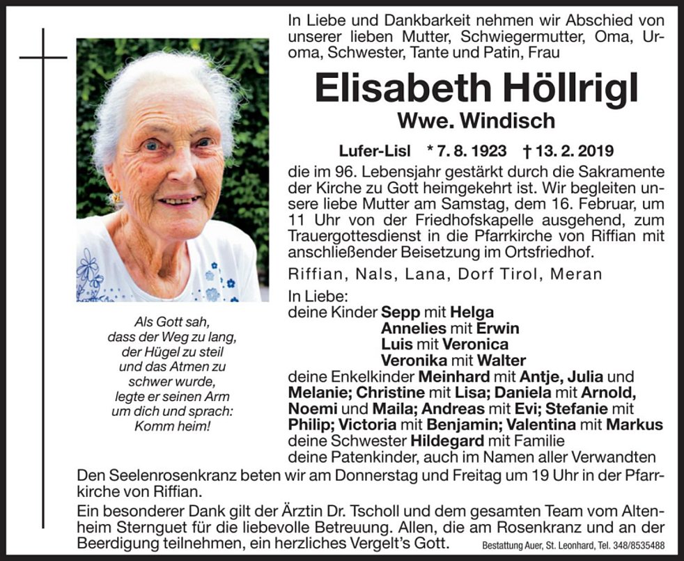die im 96. Lebensjahr gestärkt durch die Sakramente der Kirche zu Gott heimgekehrt ist. Wir begleiten unsere liebe Mutter am Samstag, dem 16. Februar, um 11 Uhr von der Friedhofskapelle ausgehend, zum Trauergottesdienst in die Pfarrkirche von Riffian mit anschließender Beisetzung im Ortsfriedhof.