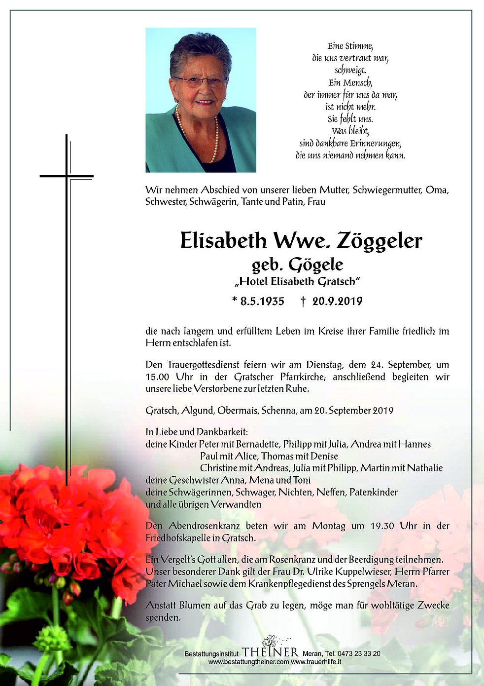 Ein Vergelt's Gott allen, die am Rosenkranz und der Beerdigung teilnehmen.Unser besonderer Dank gilt der Frau Dr. Ulrike Kuppelwieser, Herrn Pfarrer Pater Michael sowie dem Krankenpflegedienst des Sprengels Meran.