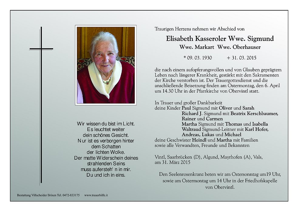 die nach einem aufopferungsvollen und von Glauben geprägtem Leben nach längerer Krankheit, gestärkt mit den Sakramenten der Kirche verstorben ist. Der Trauergottesdienst und die anschließende Beisetzung finden am Ostermontag, den 6. April um 14.30 Uhr in der Pfarrkirche von Obervintl statt.