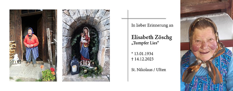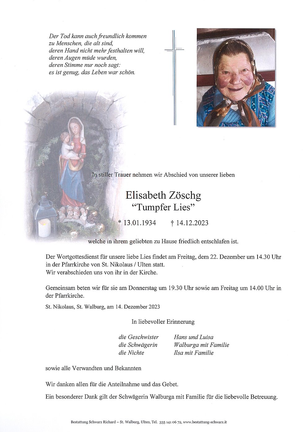Der Wortgottesdienst für unsere liebe Lies findet am Freitag, dem 22. Dezember um 14.30 Uhr in der Pfarrkirche von St. Nikolaus / Ulten statt.