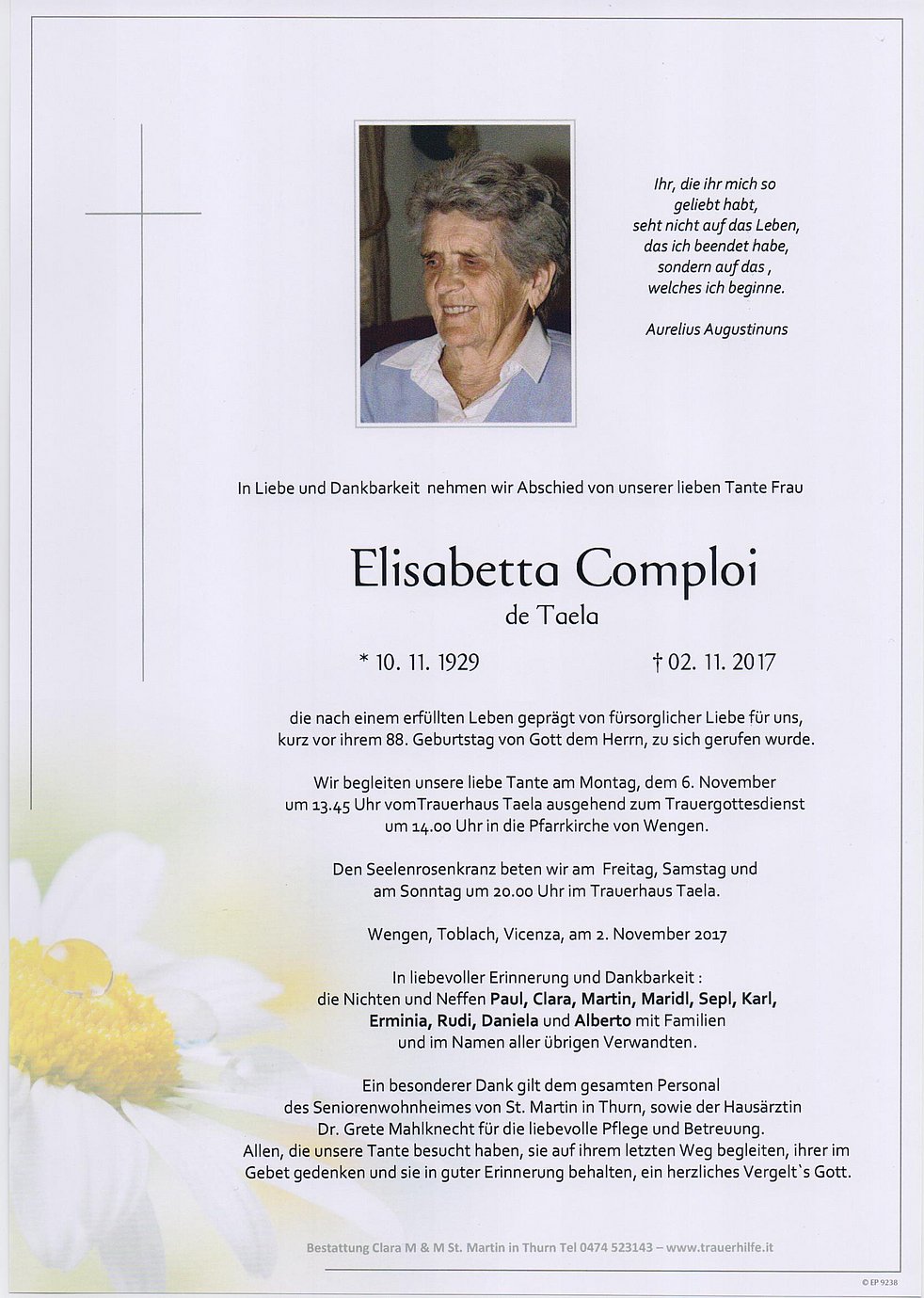 Ein besonderer Dank gilt dem gesamten Personal des Seniorenwohnheimes von St. Martin in Thurn, sowie der Hausärztin Dr. Grete Mahlknecht für die liebevolle Pflege und Betreuung.
