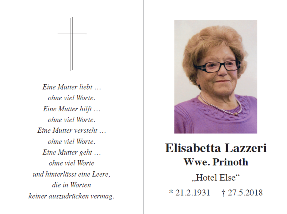 Ein besonderer Dank gilt dem gesamten Pflegepersonal des Altersheimes San Durich und den Ärzten Dr. Valentin Tröbinger und Dr. Giuliano Piccoliori für die liebevolle Betreuung.