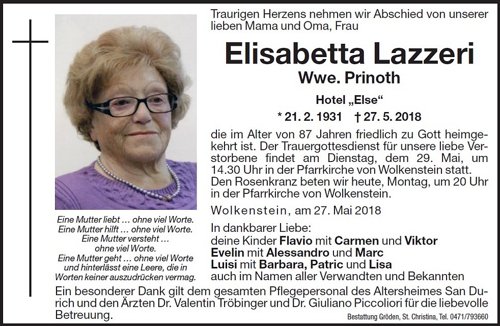Der Trauergottesdienst für unsere liebe Verstorbene findet am Dienstag, dem 29. Mai, um 14.30 Uhr in der Pfarrkirche von Wolkenstein statt.