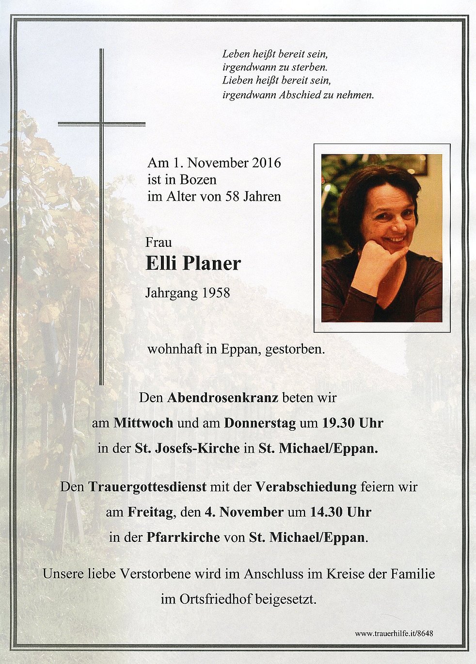Den Trauergottesdienst mit der Verabschiedung feiern wir am Freitag, den 4. November um 14.30 Uhr in der Pfarrkirche von St. Michael/Eppan.