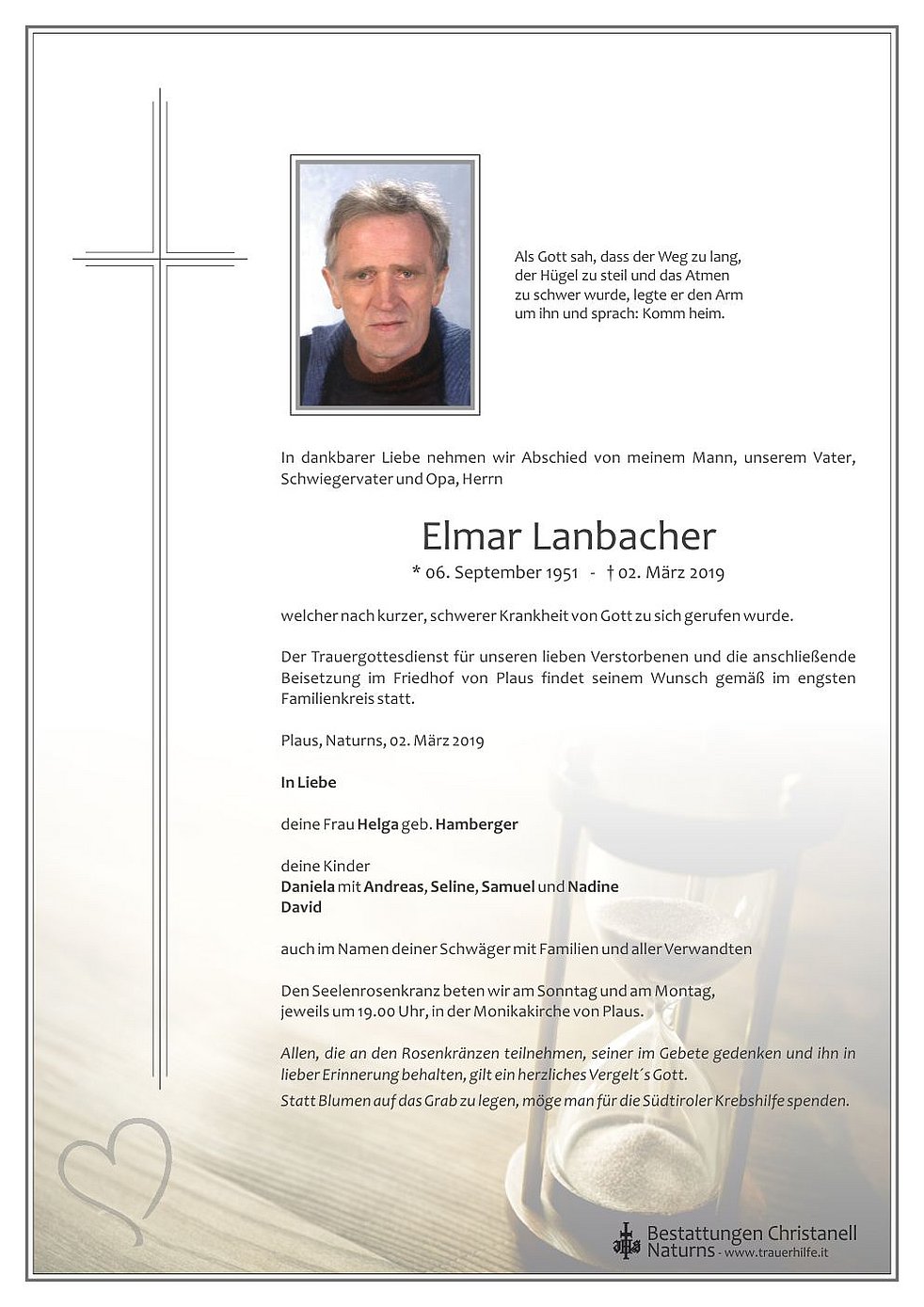 Der Trauergottesdienst für unseren lieben Verstorbenen und die anschließende Beisetzung im Friedhof von Plaus findet seinem Wunsch gemäß im engsten Familienkreis statt.