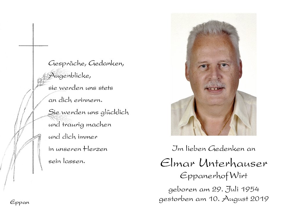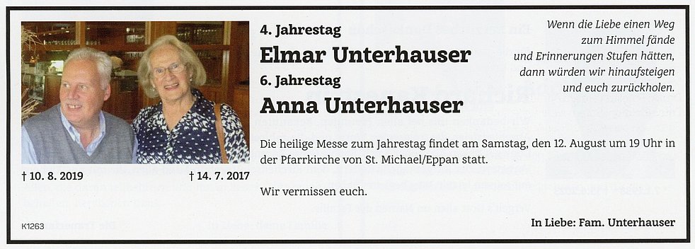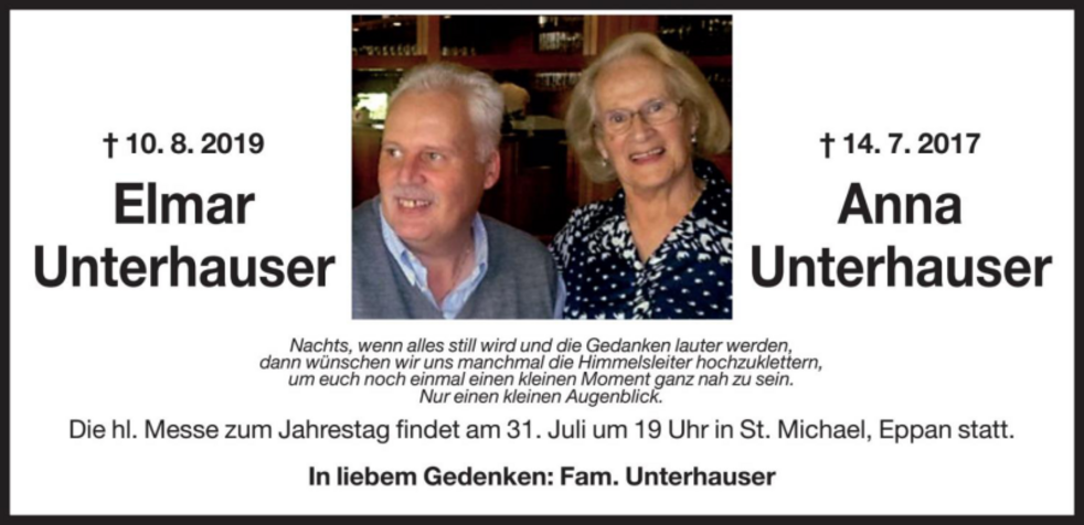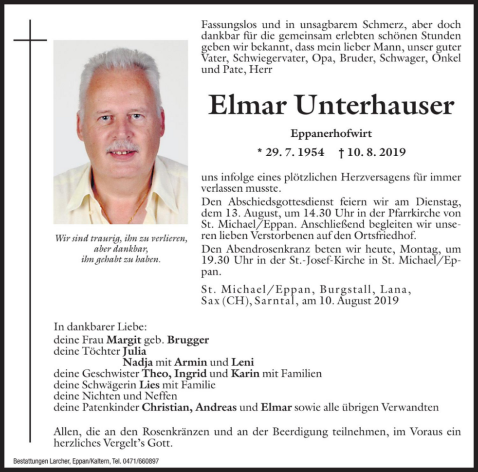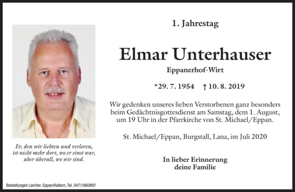 Den Abschiedsgottesdienst feiern wir am Dienstag, dem 13. August um 14.30 Uhr in der Pfarrkirche von St. Michael/Eppan. Anschließend begleiten wir unseren lieben Verstorbenen auf den Ortsfriedhof.
