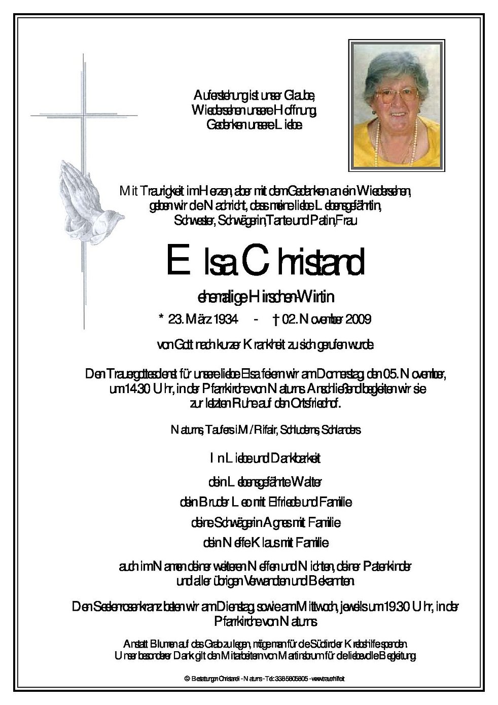 Den Trauergottesdienst für unsere liebe Verstorbene feiern wir am Donnerstag, den 05. November, um 14.30 Uhr, in der Pfarrkirche von Naturns. Anschließend begleiten wir sie zur letzten Ruhe auf den Ortsfriedhof.