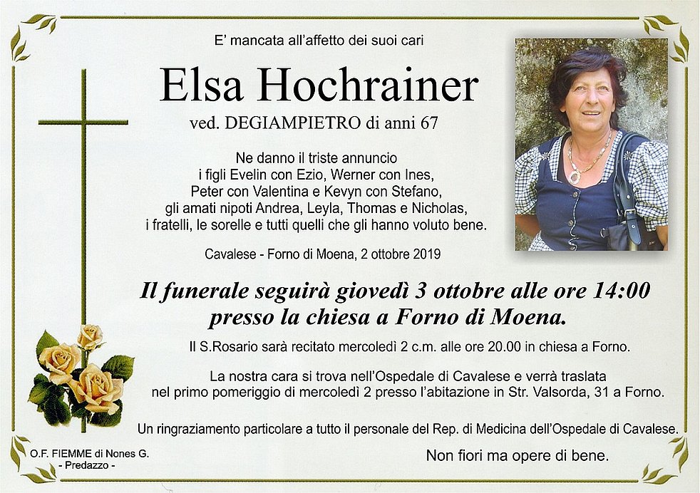 Die Trauerfeier findet am Donnerstag, dem 3. Oktober 2019 um 14.00 Uhr in der Pfarrkirche von Forno di Moena statt.