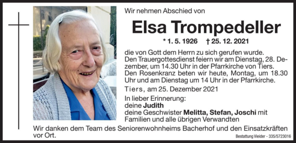 Den Trauergottesdienst feiern wir am Dienstag, 28. Dezember, um 14.30 Uhr in der Pfarrkirche von Tiers.