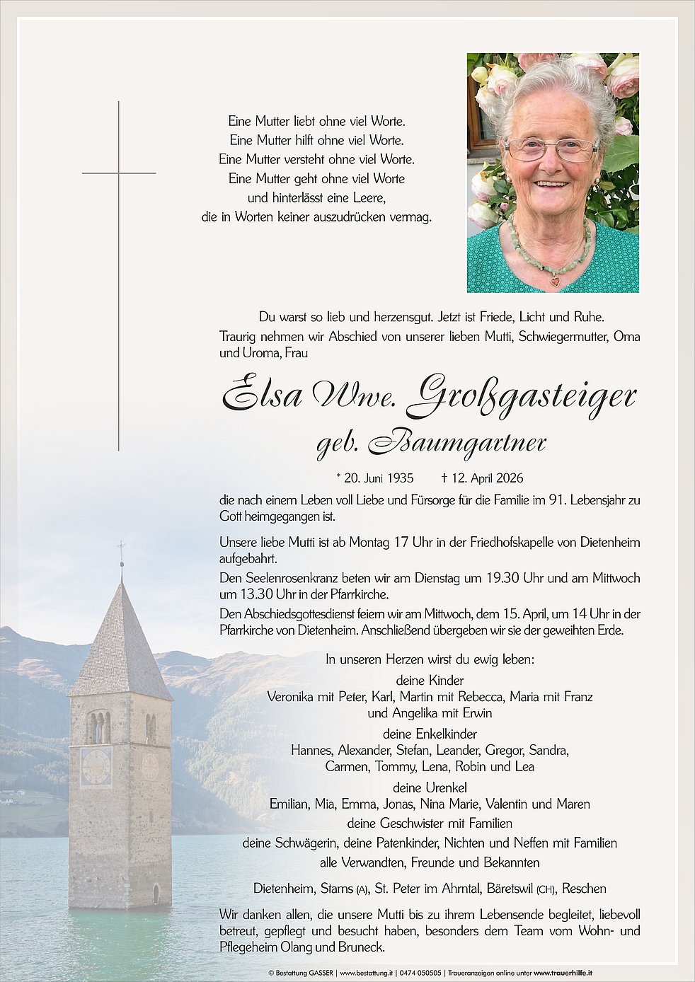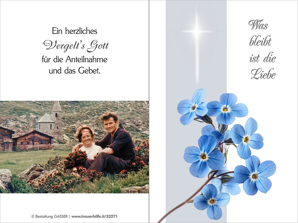 Wir danken allen, die unsere Mutti bis zu ihrem Lebensende begleitet, liebevoll betreut, gepflegt und besucht haben, besonders dem Team vom Wohn- und Pflegeheim Olang und Bruneck.
