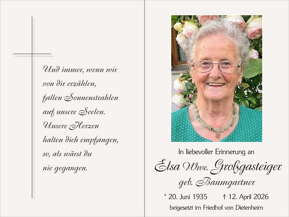 Den Abschiedsgottesdienst feiern wir am Mittwoch, dem 15. April, um 14 Uhr in der Pfarrkirche von Dietenheim. Anschließend übergeben wir sie der geweihten Erde.