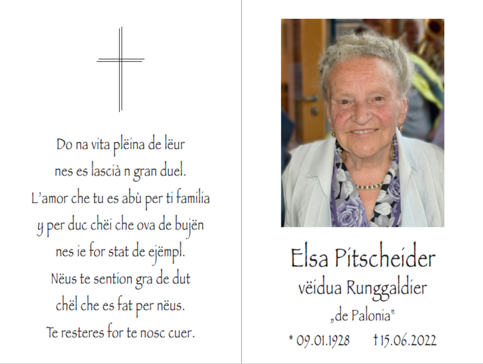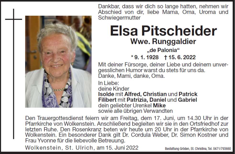 Den Trauergottesdienst feiern wir am Freitag, dem 17. Juni, um 14.30 Uhr in der Pfarrkirche von Wolkenstein. Anschließend begleiten wir sie in den Ortsfriedhof zur letzten Ruhe.