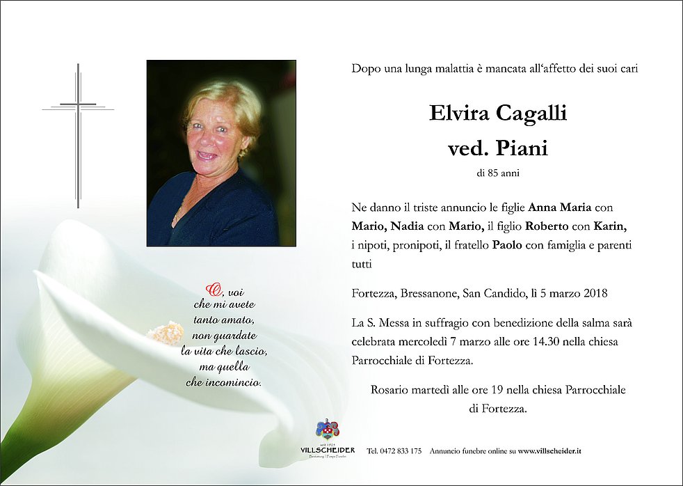 La S. Messa in suffragio con benedizione della salma sarà celebrata mercoledì 7 marzo alle ore 14.30 nella chiesa Parrocchiale di Fortezza.