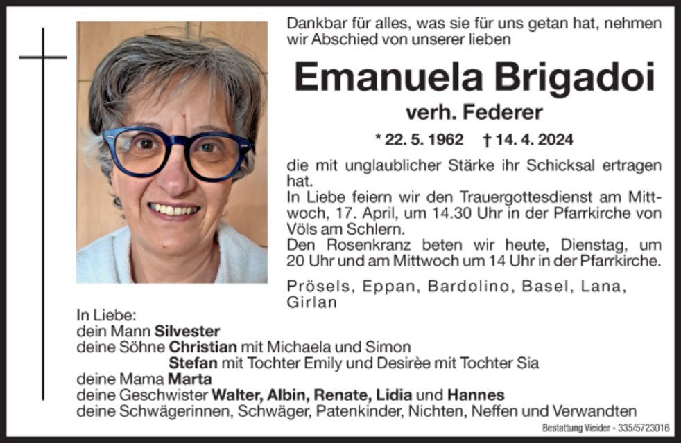 In Liebe feiern wir den Trauergottesdienst am Mittwoch, 17. April, um 14.30 Uhr in der Pfarrkirche von Völs am Schlern.