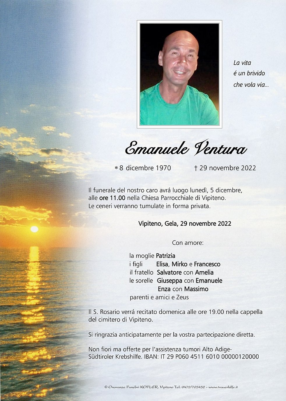 Non fiori ma offerte per l‘assistenza tumori Alto Adige- Südtiroler Krebshilfe. IBAN: IT 29 P060 4511 6010 00000120000