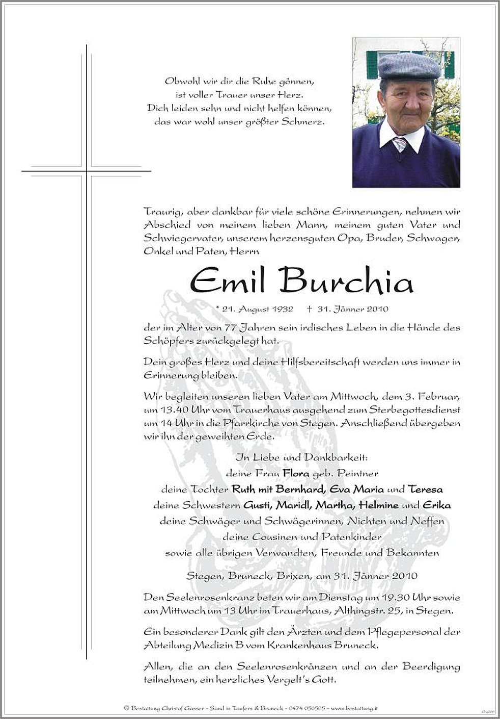 Wir begleiten unseren lieben Vater am Mittwoch, dem 3. Februar, um 13.40 Uhr vom Trauerhaus ausgehend zum Sterbegottesdienst um 14 Uhr in die Pfarrkirche von Stegen. Anschließend übergeben wir ihn der geweihten Erde.