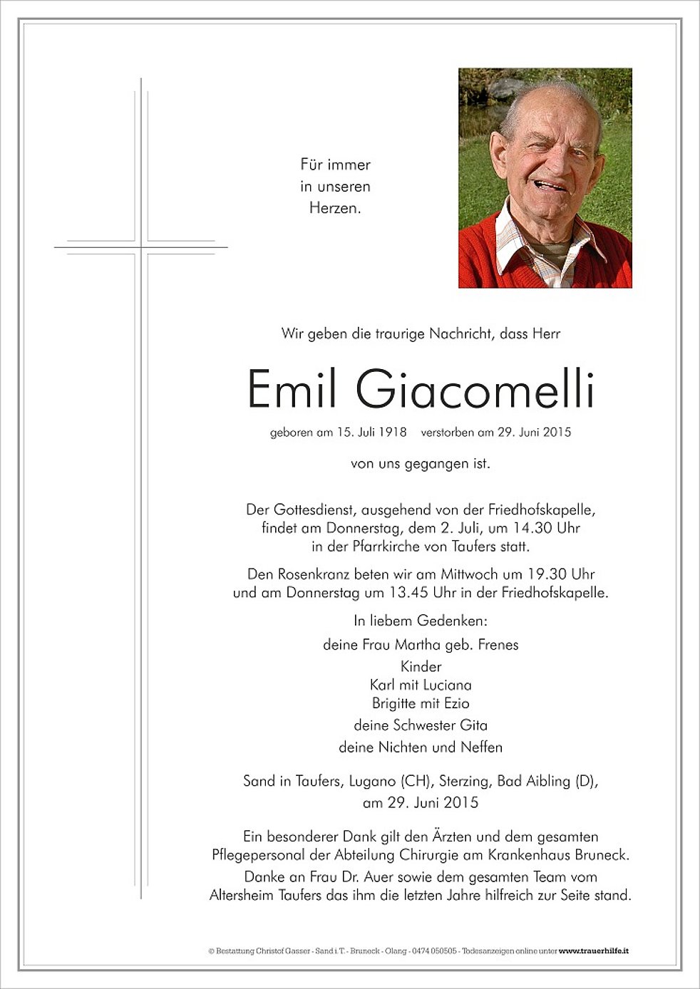 Die Nachricht, dass unser lieber Freund Emil Giacomelli verstorben ist, hat uns sehr traurig gemacht. Wir danken ihm und seiner Frau Martha für viele schöne Stunden in Sand in Taufers. Wir waren und wir werden Emil, Martha und der Familie weiterhin sehr