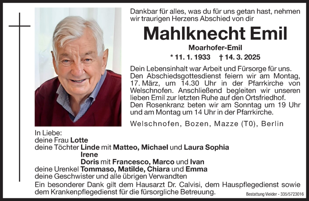 Den Abschiedsgottesdienst feiern wir am Montag, 17. März, um 14.30 Uhr in der Pfarrkirche von Welschnofen. Anschließend begleiten wir unseren lieben Emil zur letzten Ruhe auf den Ortsfriedhof.