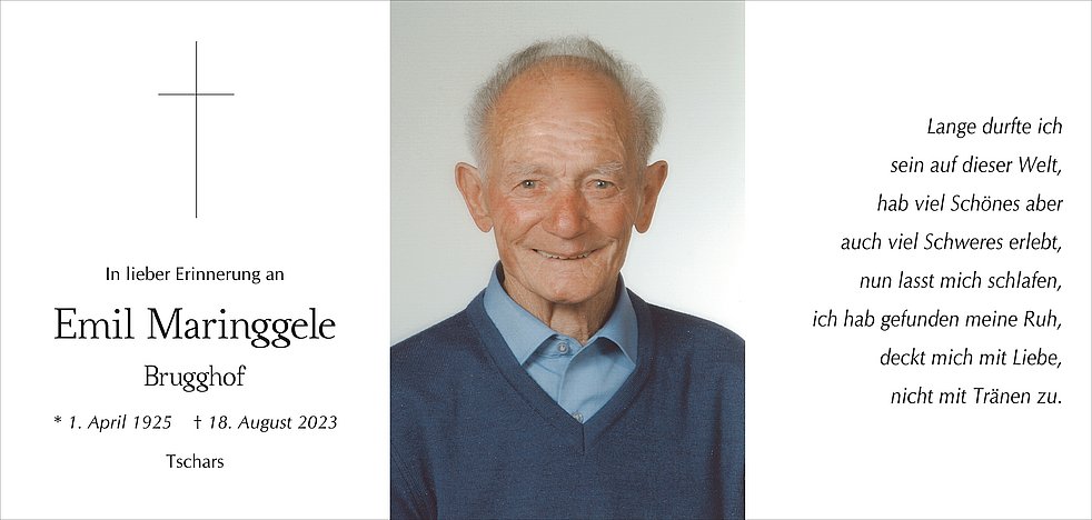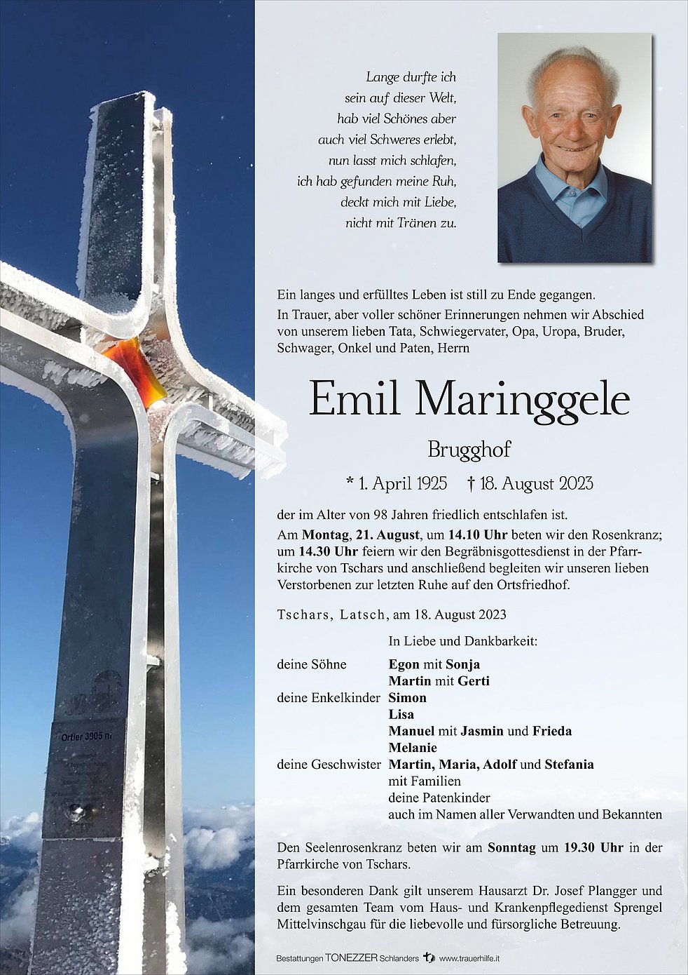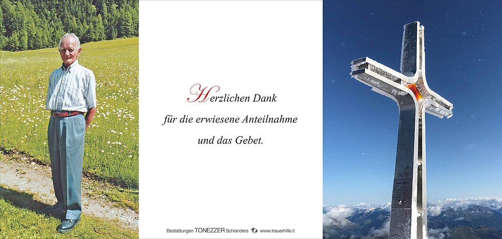 Begräbnisgottesdienst: 21.08. - 14:30 Uhr Pfarrkirche Tschars