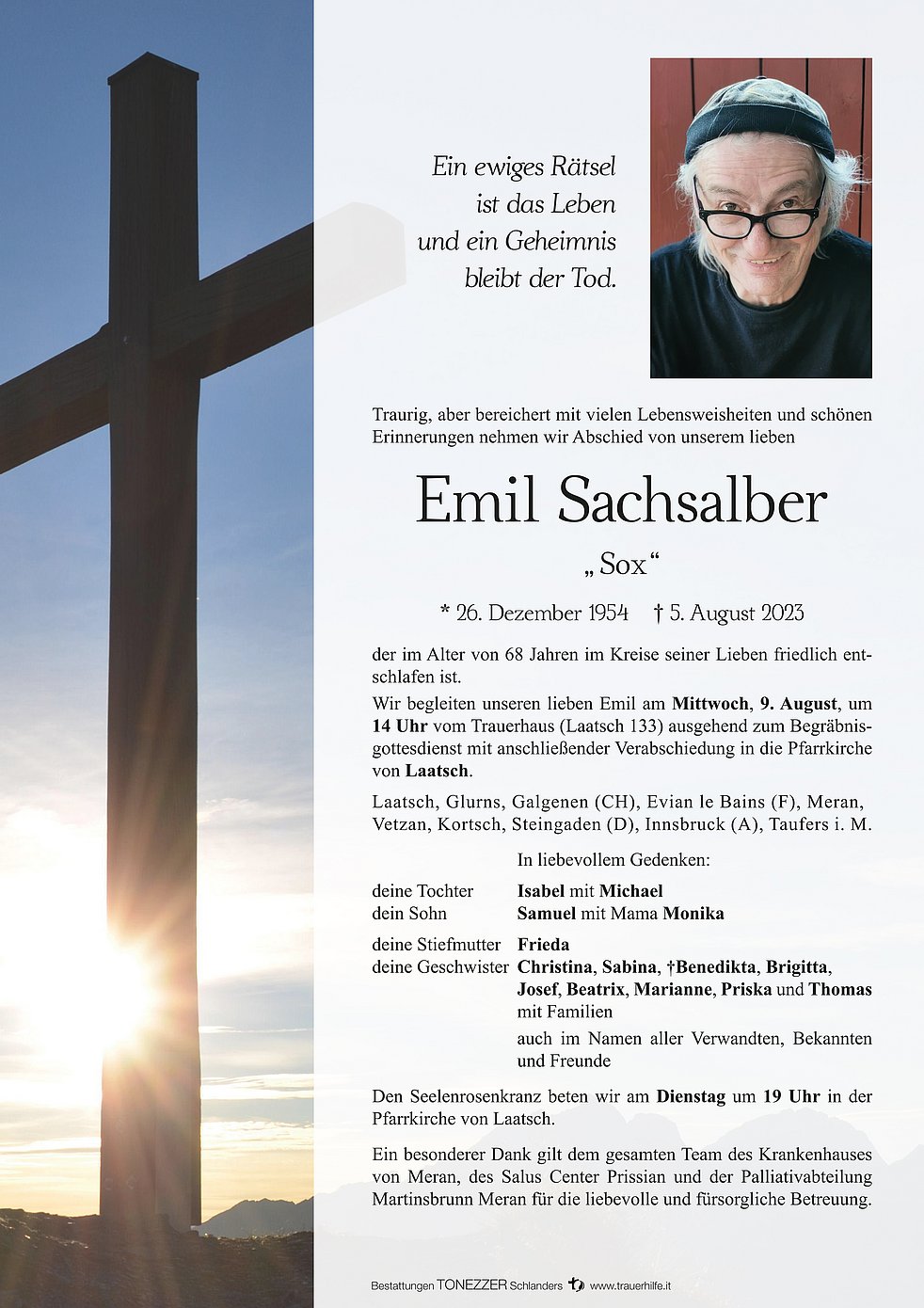 Wir begleiten unseren lieben Emil am Mittwoch, 9. August, um 14 Uhr vom Trauerhaus (Laatsch 133) ausgehend zum Begräbnisgottesdienst mit anschließender Verabschiedung in die Pfarrkirche von Laatsch.
