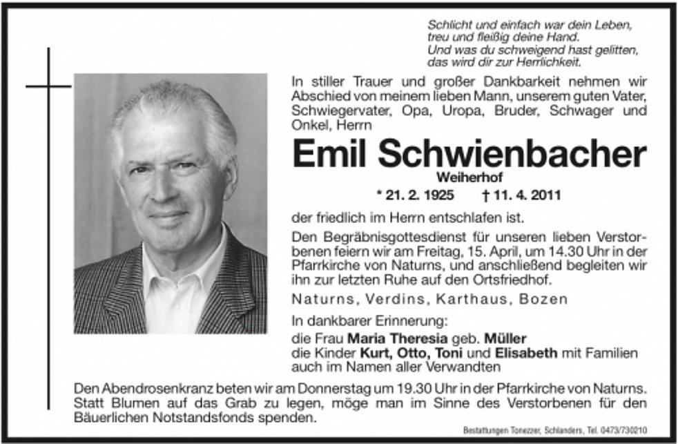 Den Begräbnisgottesdienst für unseren lieben Verstorbenen feiern wir am Freitag, 15. April, um 14.30 Uhr in der Pfarrkirche von Naturns, und anschließend begleiten wir ihn zur letzten Ruhe auf den Ortsfriedhof.