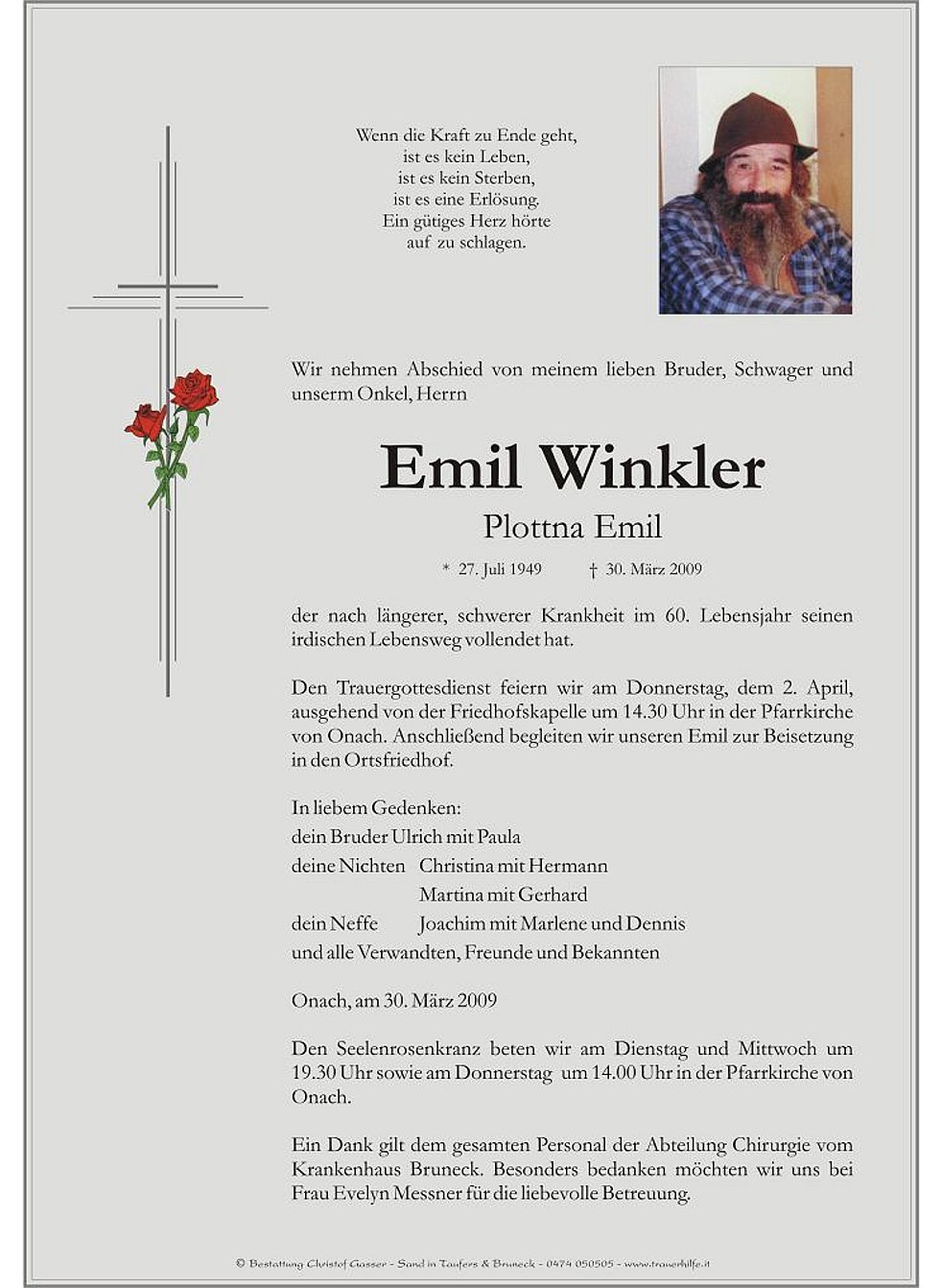 Den Trauergottesdienst feiern wir am Donnerstag, dem 2. April, ausgehend von der Friedhofskapelle um 14.30 Uhr in der Pfarrkirche von Onach. Anschließend begleiten wir unseren Emil zur Beisetzung in den Ortsfriedhof.