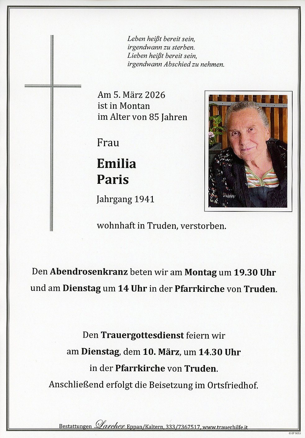 Ein herzlicher Dank dem gesamten Personal des Altenheimes Neumarkt-Montan, der Abteilung Dermatologie des Krankenhauses Bozen und allen die Emilia beigestanden sind.
