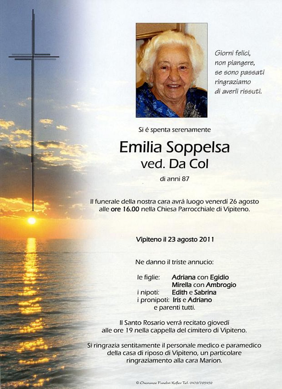 Il funerale della nostra cara avrá luogo venerdí 26 agosto