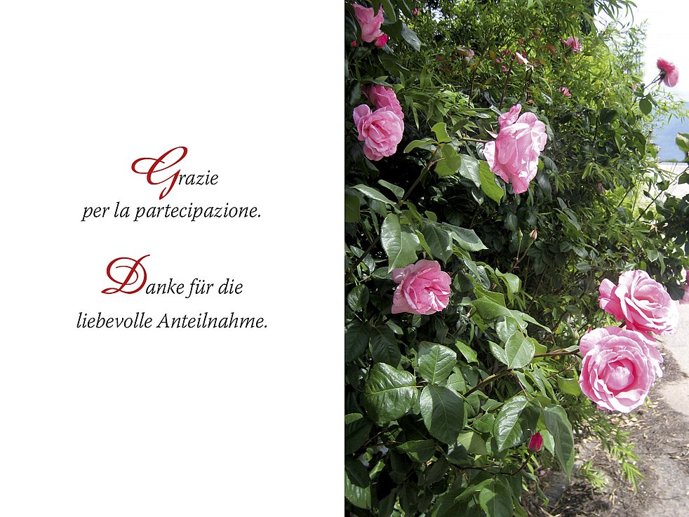 Unser herzlicher Dank gilt Frau Gisella und dem gesamten Personal der Abteilung Medizin des Krankenhauses Bozen, den Pflegerinnen des Sanitätssprengels Überetsch, vor allem Eva und Maria Luise, für die liebevolle Betreuung. Ebenso danken wir unseren Verwandten und Freunden die uns Nahe waren.