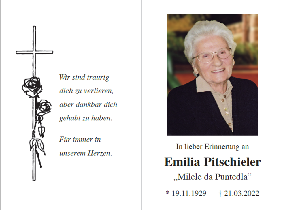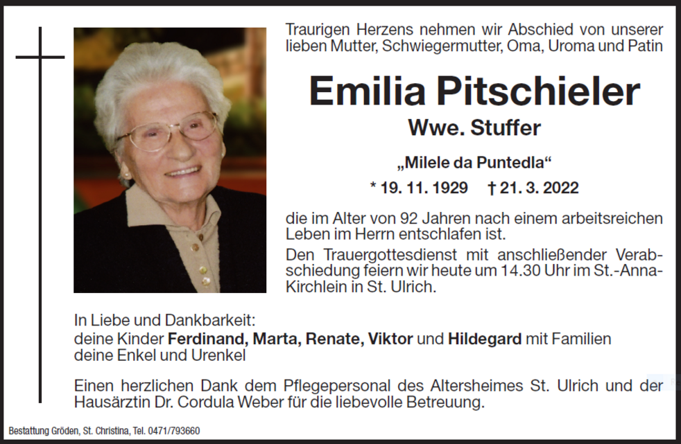 Den Trauergottesdienst mit anschließender Verabschiedung feiern wir am Mittwoch, dem 23. März, um 14.30 Uhr im St.-Anna-Kirchlein in St. Ulrich.